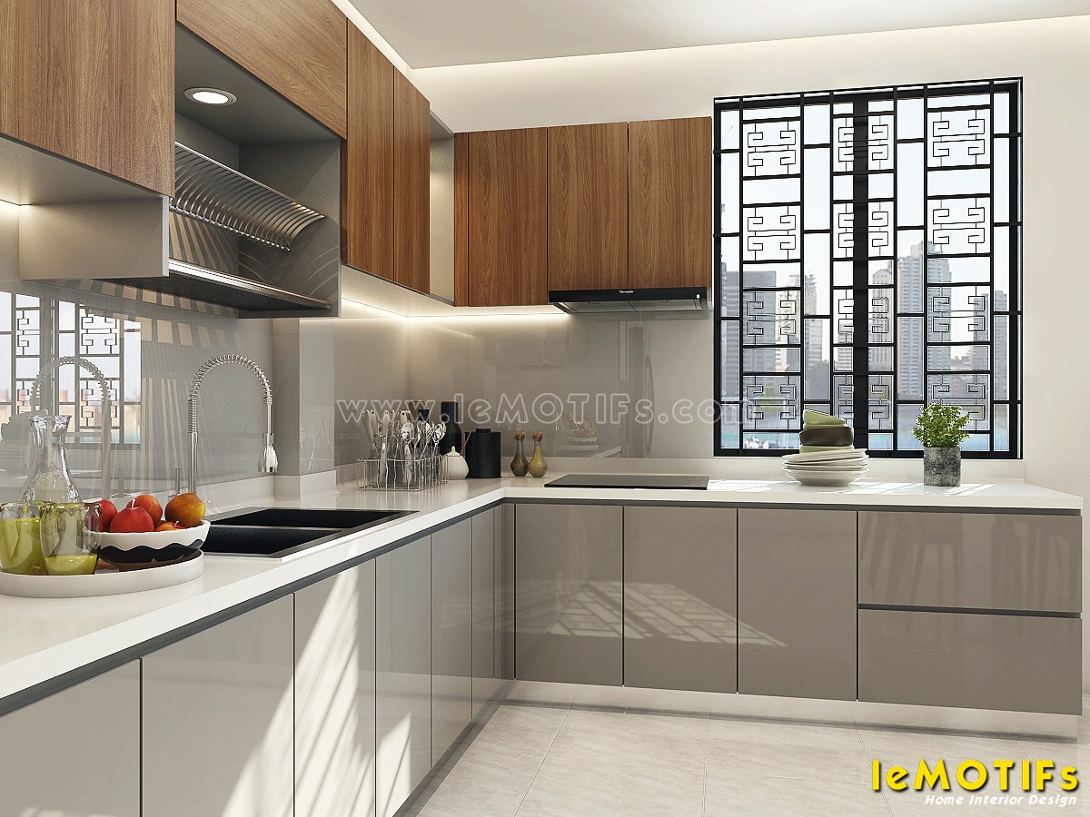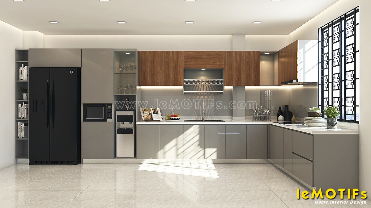 Tận dụng ánh sáng tự nhiên từ cửa sổ trong phòng bếp, leMOTIFs đã khéo léo kết hợp màu xám và vân gỗ để tránh sự nhàm chán, khu bếp bỗng trở nên tiện lợi và thông minh, không gian trở nên rộng rãi và thoải mới với mẫu thiết kế tủ bếp Acrylic cùng những phụ kiện tủ bếp hiện đại.