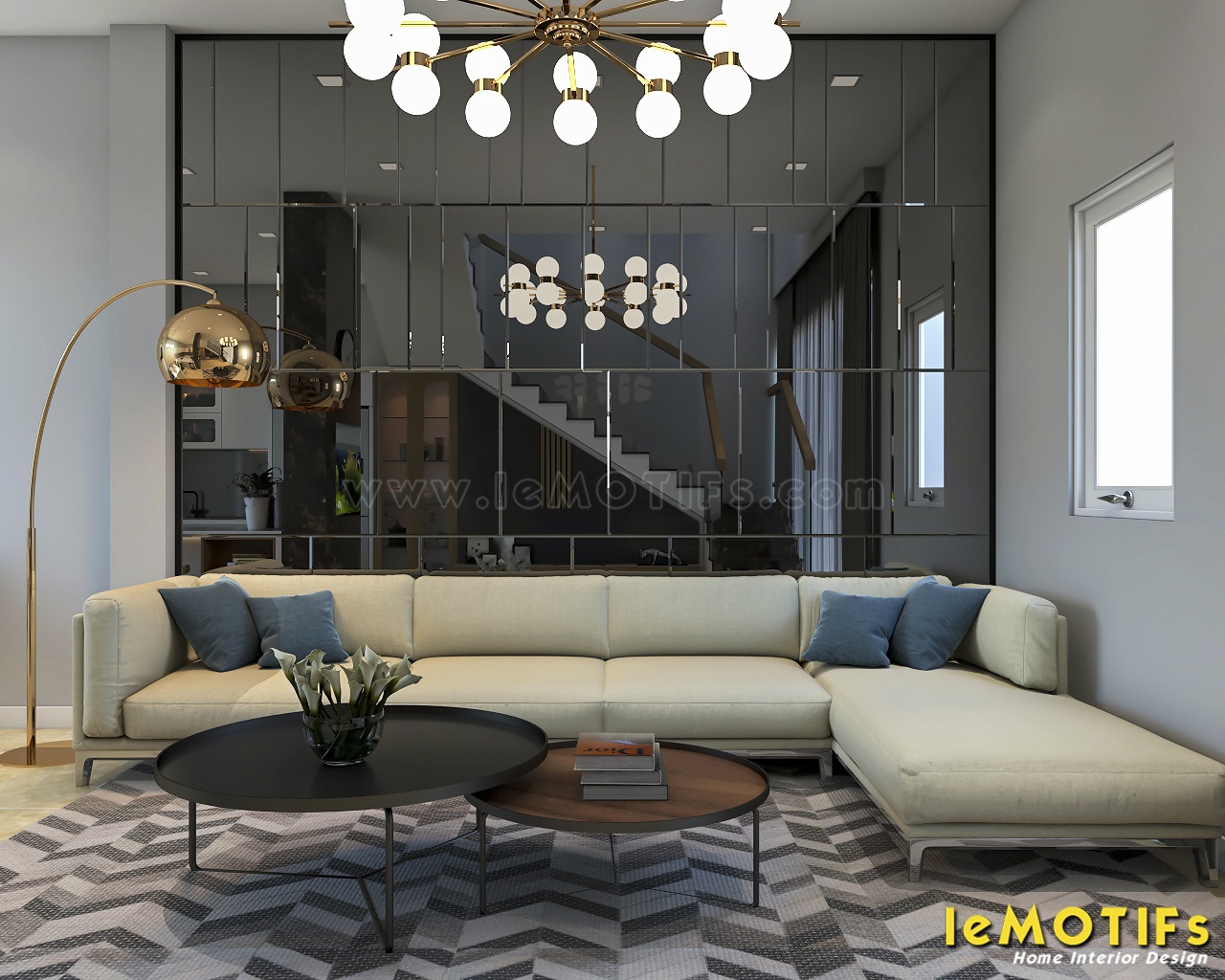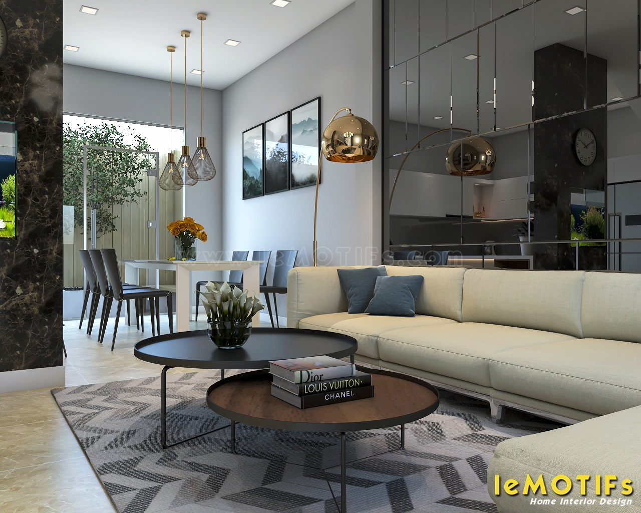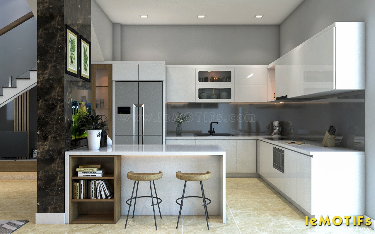 Thiết kế tủ bếp nhà chị Lụa sử dụng tông màu trắng với vật liệu Acrylic bóng gương, những mảng màu đối lập luôn được leMOTIFs khéo léo sắp đặt để không làm phản tác dụng.