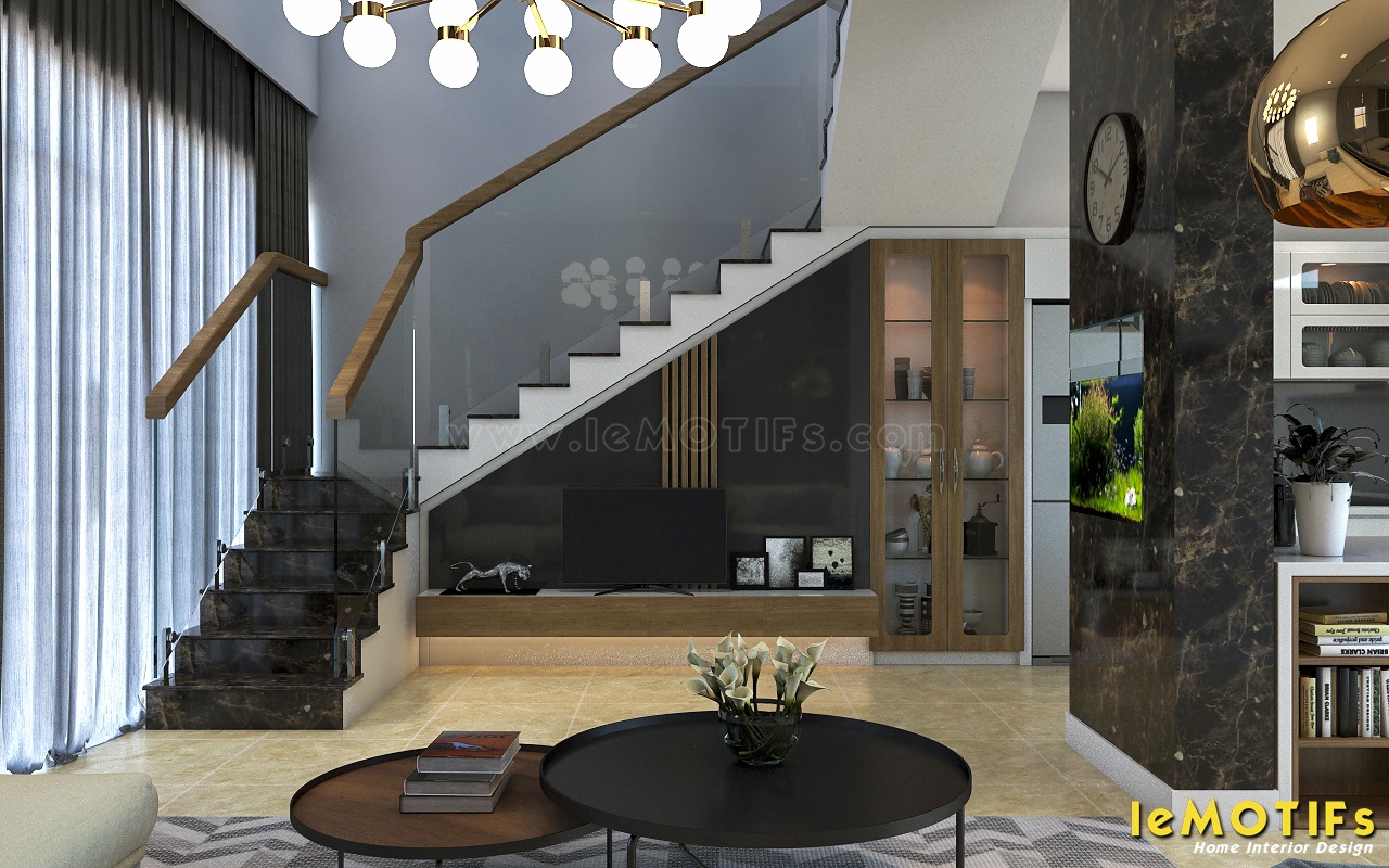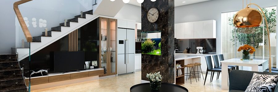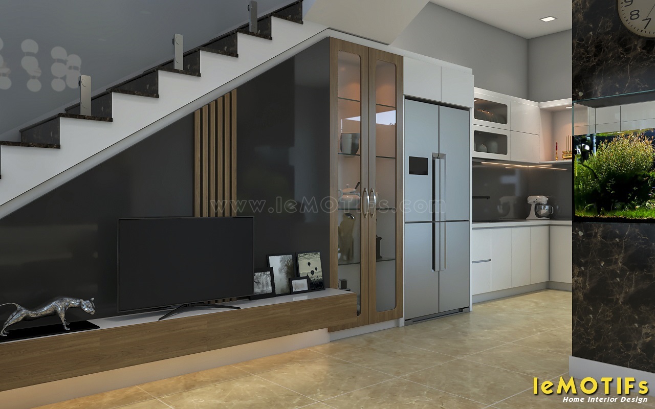 Nếu như tủ bếp với tông màu sáng thì đối lập là kệ tivi với tông màu tối nhưng vẫn có sự liên kết hài hòa giữa hai khu vực. Đặc biệt, cột nhà được che lấp một cách tinh tế với cách ốp đá lạ mắt kết hợp với hồ cá ở giữa, tạo cảm giác thoải mái chứ không bị nặng nề.